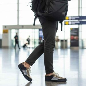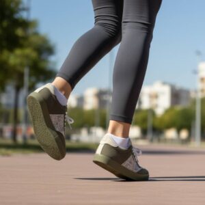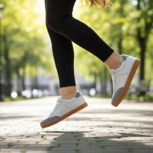 Turnschuhe mit doppelter Sohle aus einem grausamkeitsfreien Material, das sich ähnlich anfühlt und ähnliche Eigenschaften hat wie Leder, aber völlig vegan ist, frei von Tierleid.